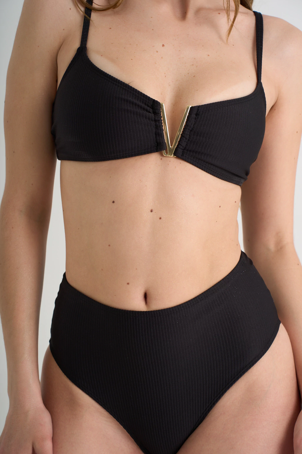 Corpiño para atar en por espalda. Breteles regulables. Avio metálico dorado en forma de V. Incluye tazas soft desmontables.